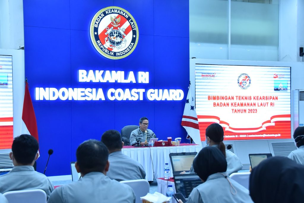 (Bakamla RI/Indonesian Coast Guard) — Kepala Bakamla RI yang di wakili Kabag TU dan Rumga Bakamla RI Kolonel Bakamla Dr. Eddy H.H. Panjaitan, S.H., S.E., M.M., CSBA. membuka Bimbingan Teknis (Bimtek) Kearsipan Tahun 2023 di Aula Ary Hasibuan Mabes Bakamla RI, Jakarta Pusat, Senin (20/03/2023).