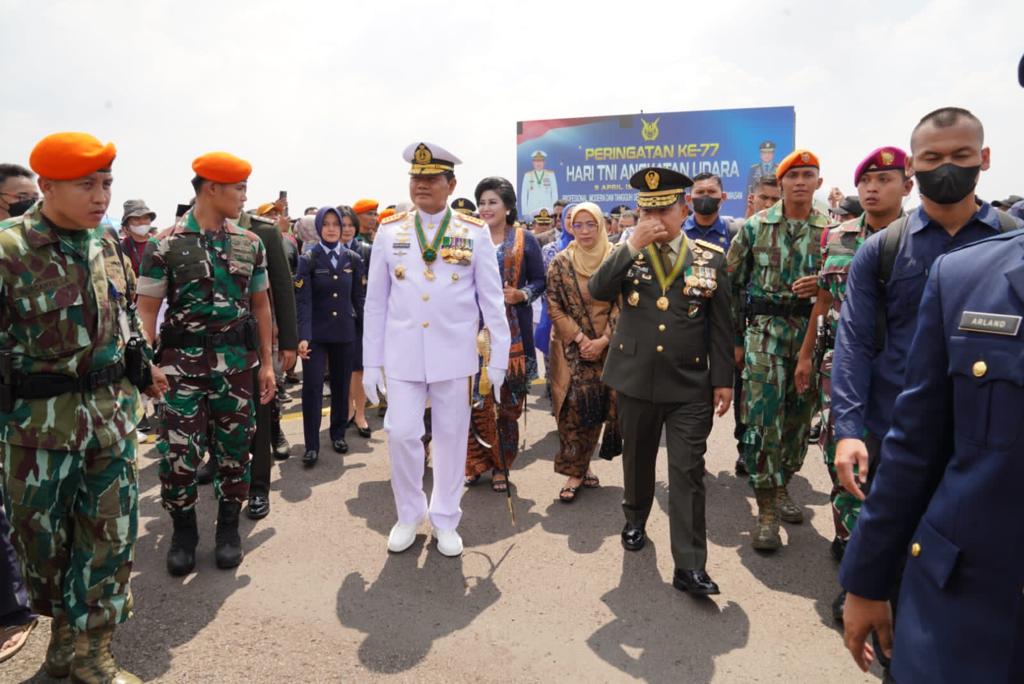 Lebih lanjut, Panglima TNI menyampaikan bahwa selama 77 tahun TNI Angkatan Udara selalu hadir dalam setiap panggilan tugas Ibu Pertiwi, baik dalam rangka Operasi Militer Perang maupun Operasi Militer Selain Perang. “Untuk itu, saya mengucapkan terima kasih dan penghargaan setinggi-tingginya, kepada seluruh Prajurit dan Pegawai Negeri Sipil, TNI Angkatan Udara, atas dedikasi, profesionalisme, dan loyalitas yang kalian tunjukkan selama ini,” ujar Panglima TNI.