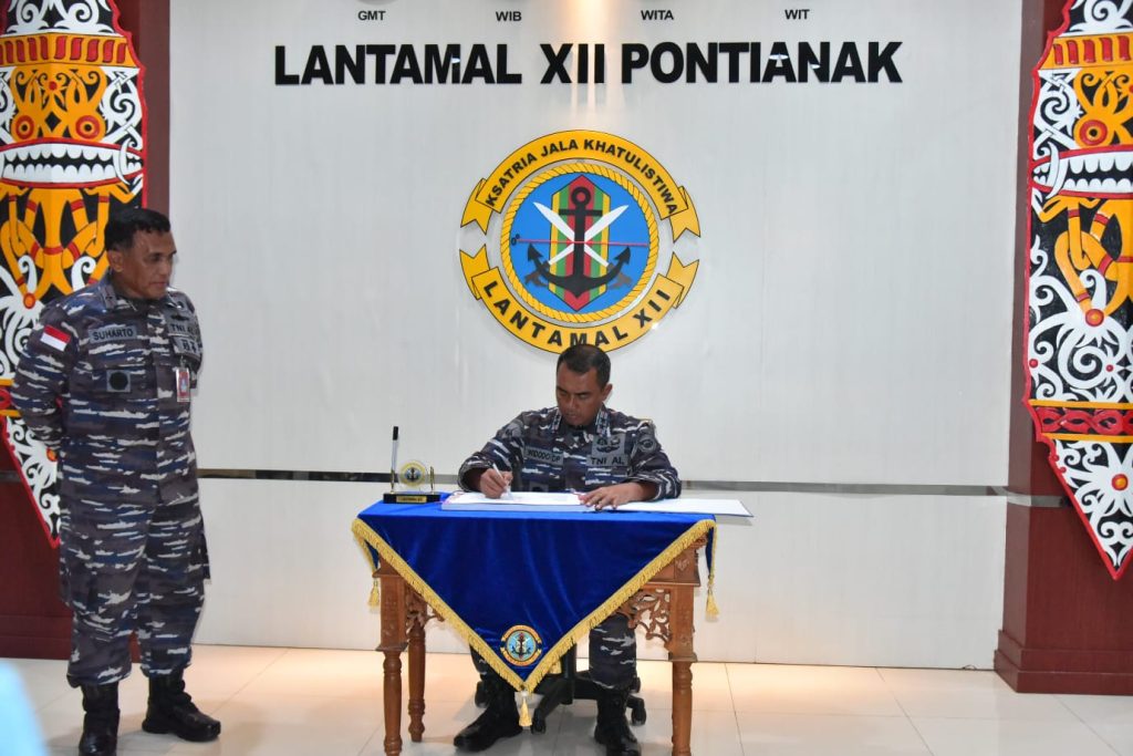 Danlantamal XII Laksamana Pertama TNI Dr. Suharto mengucapkan selamat datang dan terima kasih atas kunjungan Dankormar di Lantamal XII khususnya di Kalimantan Barat dan memaparkan wilayah kerja Lantamal XII dan Yonmarhanlan XII.