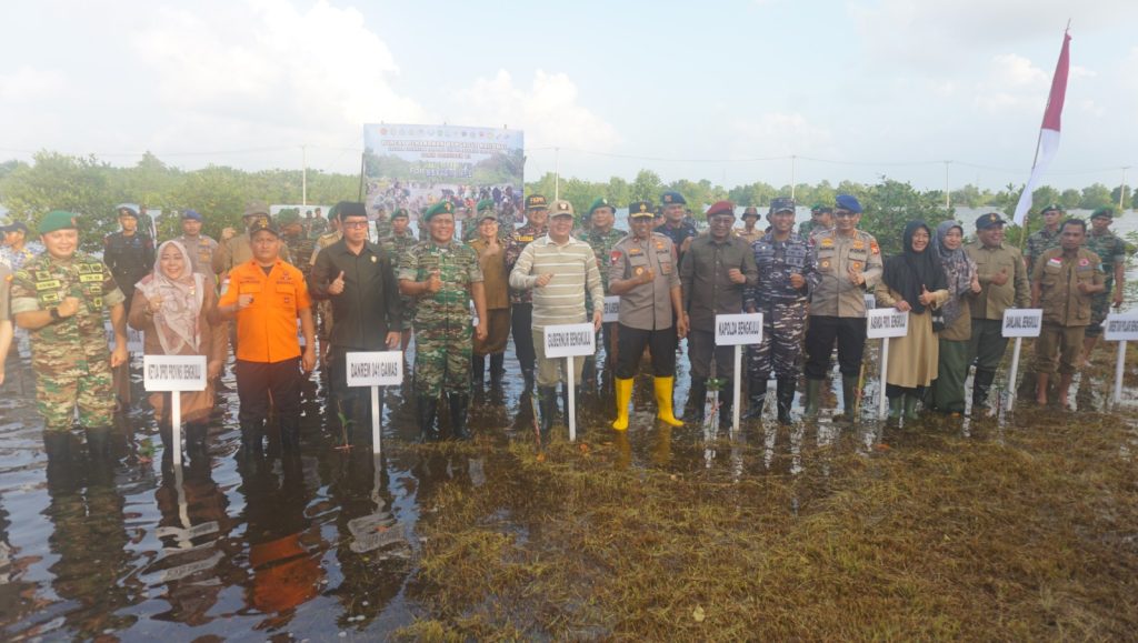 TNI AL, Bengkulu,– Pangkalan TNI Angkatan Laut (Lanal) Bengkulu bersama Forkopimda Provinsi Bengkulu dan Kota Bengkulu, serta unsur maritim melaksanakan penanaman mangrove serentak se-Indonesia yang dipimpin oleh Presiden Republik Indonesia Ir. H. Joko Widodo dengan didampingi oleh Panglima TNI Laksamana TNI Yudo Margono, S.E., M.M., beserta Pejabat Utama Mabesal melalui Vicon, Senin (15/05/2023).