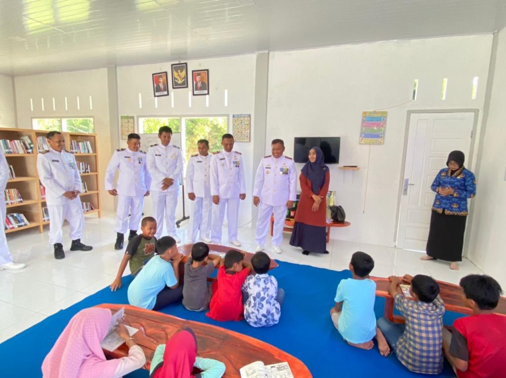 TNI AL, Simeulue,- Komandan Lanal Simeulue Letkol Laut (P) Dwi Herdian Saputra, M.Tr.Opsla., beserta Ketua Jalasenastri Cabang 8 Korcab I DJA I dan Perwira Staf Lanal Simeulue, memberikan edukasi kepada anak-anak sekitar Mako Lanal Simeulue tentang nilai-nilai Pancasila, bertempat di Saung Pintar Lanal Simeulue, Kamis (01/06/2023).