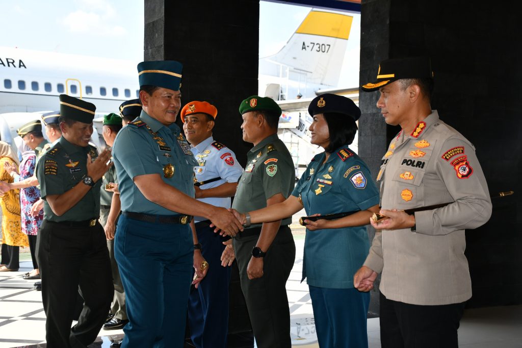 TNI AL, Bandung,- Komandan Pangkalan TNI Angkatan Laut (Danlanal) Bandung Kolonel Laut (KH/W) Dr. Renny Setiowati, S.T., M.Sc., M.Tr.Hanla., bersama jajaran Forkopimda Jawa Barat menyambut kedatangan Panglima TNI Laksamana TNI Yudo Margono, S.E., M.M., C.S.F.A., beserta rombongan dengan menggunakan Pesawat TNI AU Boeng 737/A-7306, bertempat di Sompil Lanud Husein Sastra Negara Bandung, Kamis (08/06/2023).