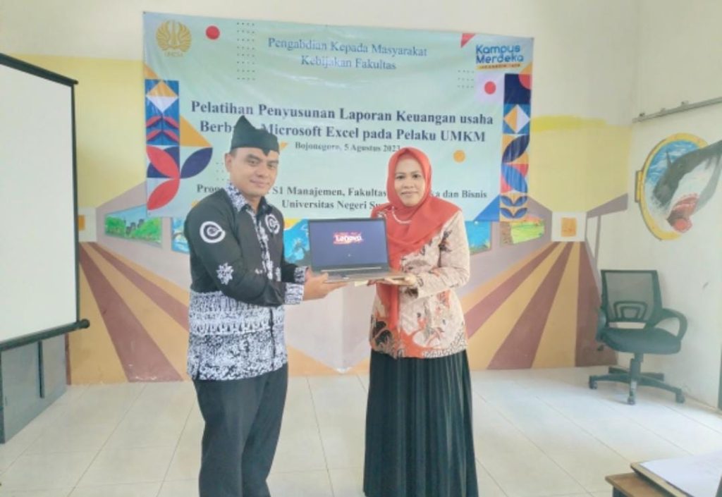 Fakultas Ekonomika dan Bisnis merupakan salah satu fakultas di Universitas Negeri Surabaya yang menyelenggarakan program pengabdian kepada masyarakat kebijakan fakultas di Kabupaten Bojonegoro. Dr. Nadia Asandimitra Haryono, SE, MM. selaku ketua program pelatihan penyusunan laporan keuangan usaha berbasis Microsoft Excel pada pelaku UMKM menyampaikan harapan nya bahwa ilmu pengelolaan keuangan ini akan bermanfaat bagi pelaku UMKM supaya mereka bisa naik kelas demi perkembangan usaha yang berkelanjutan.