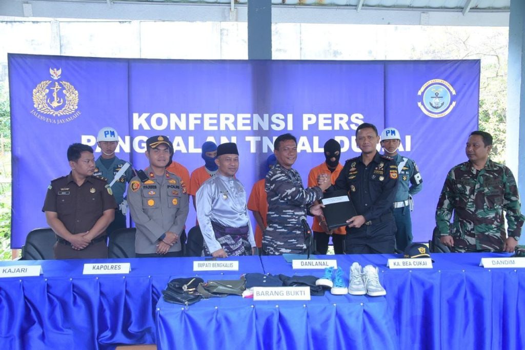 TNI AL, Dumai, 11 Agustus 2023,– Pangkalan TNI AL Dumai menyerahkan barang bukti berupa KLM Putra Sejahtera 9 beserta muatan berupa barang import bekas tanpa dokumen sebanyak 150 koli kepada KPPBC TMP C Bengkalis, yang merupakan hasil tangkapan Lanal Dumai bersama Tim Satgas Sadewa-23 Dispamsanal pada Selasa (25/7) lalu di Perairan Selat Lalang Siak Kecil Kabupaten Bengkalis.