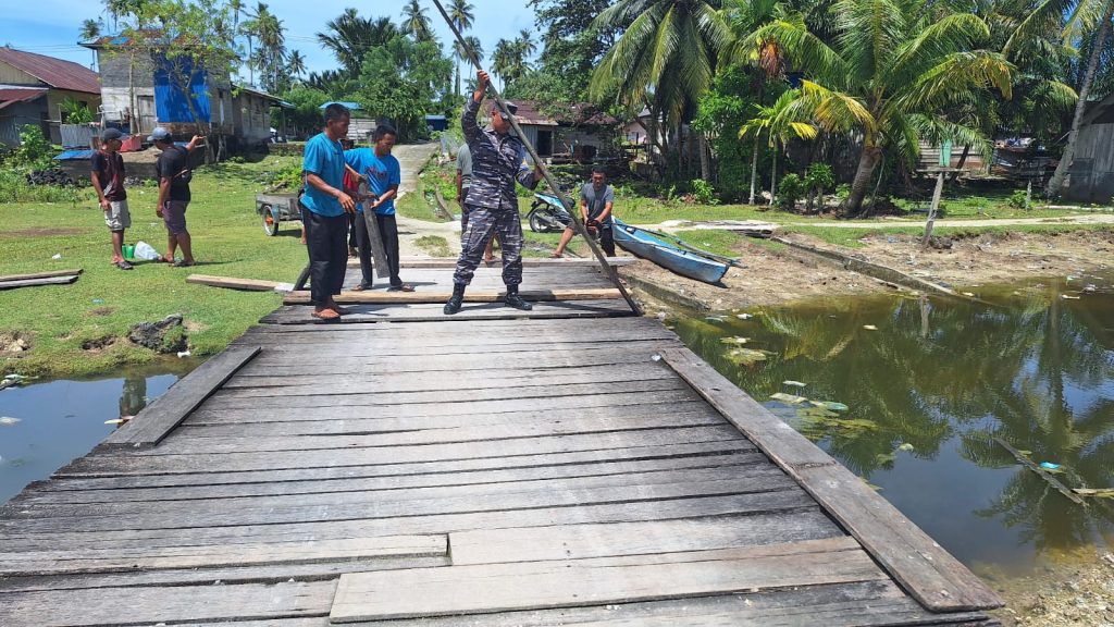 TNI AL, Simeulue,- Bintara Pembina Potensi Maritim (Babinpotmar) Pangkalan TNI AL Simeulue bersama masyarakat gotong royong perbaiki akses jembatan rusak di Desa Labuhan Bajau, Kecamatan Teupah Selatan, Kabupaten Simeulue, Rabu (30/08/2023).