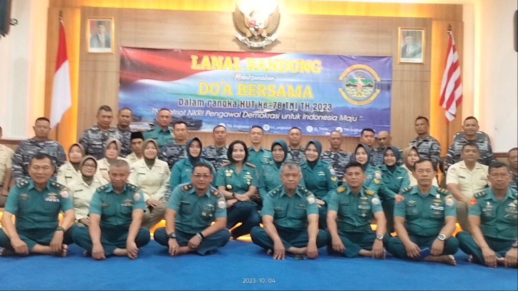 TNI AL, Bandung,- Komandan Pangkalan TNI Angkatan Laut (Danlanal) Bandung Kolonel Laut (KH/W) Dr. Renny Setiowati., S.T., M.Sc., M.Tr.Hanla., beserta Perwira, Bintara, Tamtama, dan PNS Lanal Bandung menggelar Doa Bersama dalam rangkaian Peringatan HUT ke-78 Tentara Nasional Indonesia (TNI) Tahun 2023, bertempat di Aula Mako Lanal Bandung, Jalan Aria Jipang No. 8, Kota Bandung, Rabu (04/10/2023).