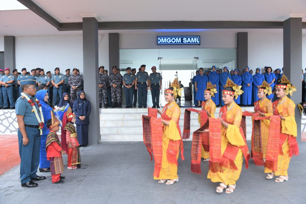 Selanjutnya Wadan Lantamal I Kolonel Marinir Sudin Kaban didampingi Ny. Dwi Sudin Kaban memakaikan Kain Ulos, sebagai ciri khas masyarakat Suku Batak yang bermakna suatu penghormatan atas kedatangan pejabat baru sebagai Komandan Lantamal I.