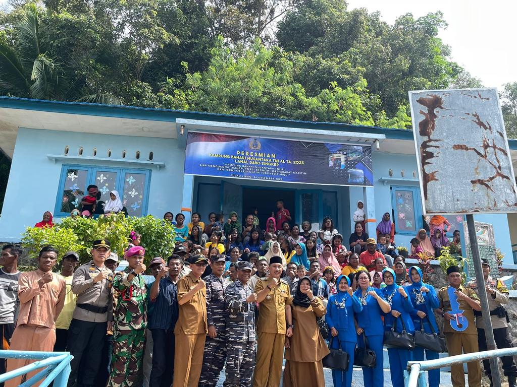TNI AL, Dabo Singkep,- Komandan Pangkalan TNI Angkatan Laut Dabo Singkep (Danlanal DBS) Letkol Laut (P) Tri Hermawan M.A, M.Tr. Opsla., yang diwakili oleh Palaksa Lanal DBS Mayor Marinir Saul Jamlaay meresmikan Kampung Bahari Nusantara (KBN) TNI AL TA. 2023 yang berlokasi di Dusun III Pulau Lipan, Desa Penuba, Kecamatan Selayar, Kabupaten Lingga, Provinsi Kepulauan Riau, Senin (04/12/2023).