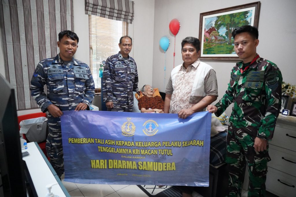 TNI AL–Dispenlantamal3. Komandan Pangkalan Utama TNI Angkatan Laut (Danlantamal) III Jakarta Brigjen TNI (Mar) Harry Indarto, S.E., M.M. diwakili oleh Kasubdiswatpers Disminpers Lantamal III Jakarta Mayor Laut (T) Aris Isnawan melaksanakan anjangsana dan pemberian bantuan sosial dari Kepala Staf Angkatan Laut (Kasal) Laksamana TNI Dr. Muhammad Ali, S.E., M.M., M.Tr.Opsla. dalam rangka memperingati Hari Dharma Samudera tahun 2024 kepada Ny. Sri Rachmani istri dari Mayor Laut (Anumerta) Memet Sastrawiria ABK RI Matjan Tutul pahlawan pertempuran Laut Aru bertempat di cluster Giorgia blok TA 6 No. 16 Kota Wisata Cibubur, Bogor, Kamis (11/01/2024).