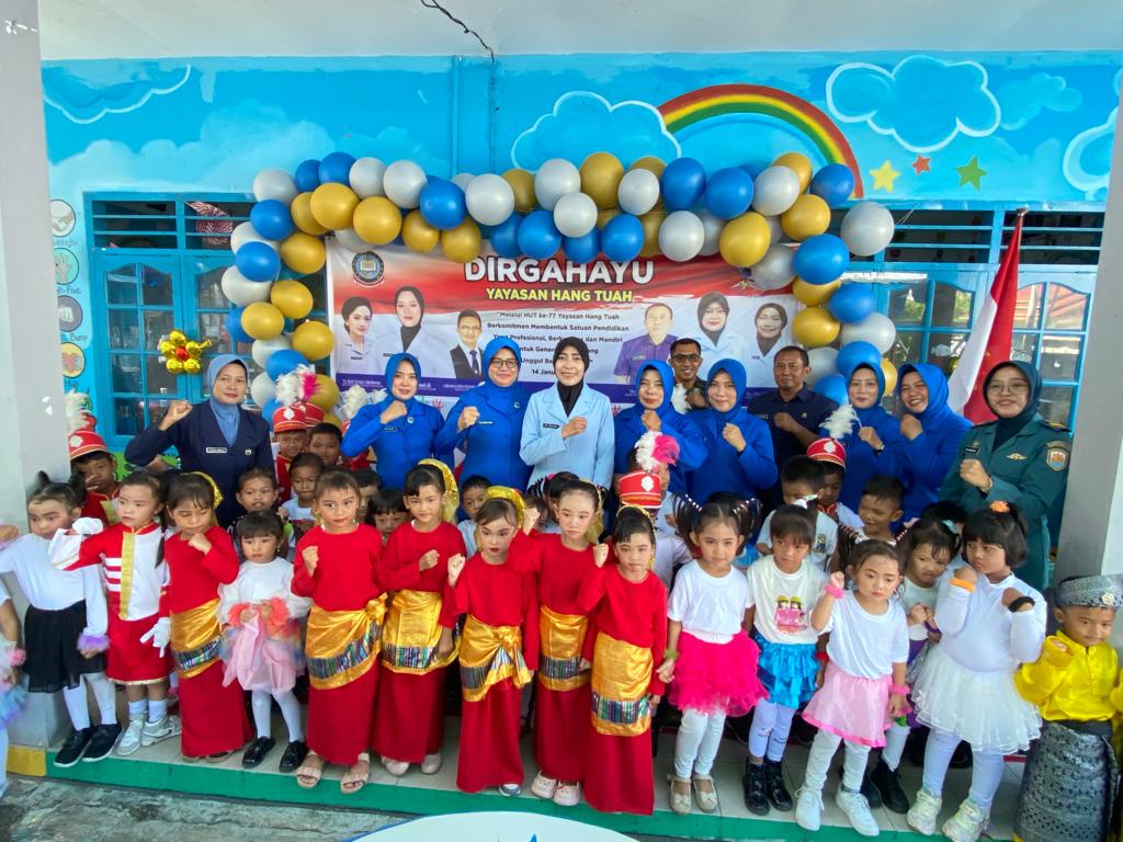 TNI AL, Bintan,- Ketua Cabang 5 Korcab IV DJA I Ny. Tika Gita Muharam melaksanakan kunjungan ke TK Hang Tuah 03 Batam dalam rangka rangkaian kegiatan HUT Yayasan Hang Tuah Ke-78 Tahun 2024. Kedatangannya disambut langsung oleh Kepala Sekolah TK Hang Tuah 03 Batam di Belakang Padang Ibu Triana Rina Susanti dan para guru, Rabu (17/01/2024).