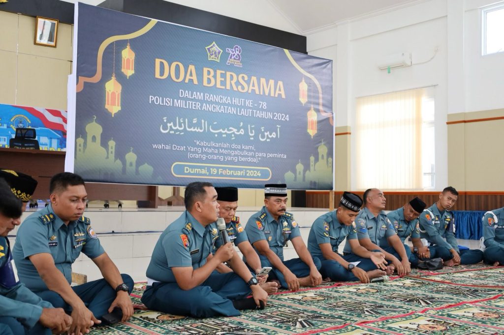 TNI AL, Dumai,- Dalam rangka memperingati HUT Ke-78 Pomal Tahun 2024, Lanal Dumai menggelar Doa bersama yang dilaksanakan terpusat dari Mako Puspomal Kelapa Gading Jakarta Utara yang diikuti secara daring dari Gedung Wijaya Kusuma Mako Lanal Dumai, Senin (19/02/2024).