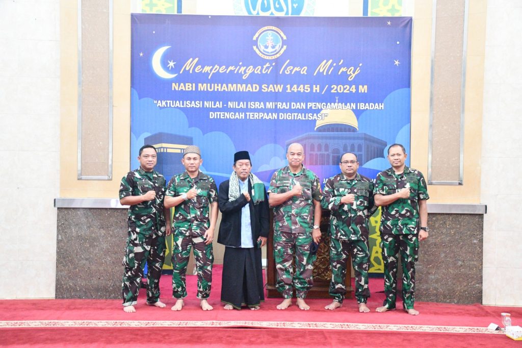 TNI AL-Dispenlantamal3. Komandan Pangkalan Utama TNI Angkatan Laut (Danlantamal) III Jakarta Brigjen TNI (Mar) Harry Indarto, S.E., M.M. diwakili Wakil Komandan (Wadan) Lantamal III Jakarta Kolonel Laut (P) Whisnu Kusardianto, S.E., M.H. menghadiri peringatan Isra Mi’raj Nabi Muhammad Shalallahu ‘Alaihi Wassalam (SAW) yang dihadiri oleh Kadopusbekbar, para Asisten Danlantamal III Jakarta, para Kasatker, prajurit dan PNS di lingkungan Lantamal III Jakarta serta pengurus Korcab III DJA I dengan penceramah Dr. K.H. Chalabi, M.A. bertempat di masjid Miftahul Jannah Mako Lantamal III Jakarta Jl. Gunung Sahari No. 2 Ancol, Jakarta Utara, Rabu (21/02/2024).