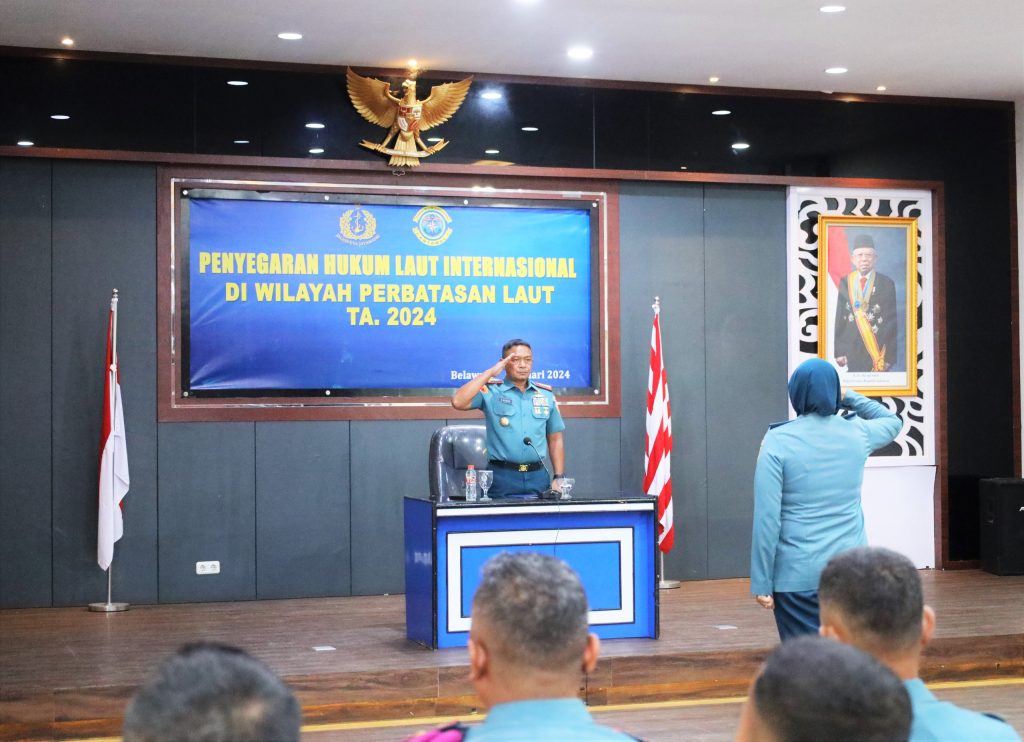 TNI AL, Belawan,- Komandan Pangkalan Utama TNI Angkatan Laut I (Danlantamal I) Brigjen TNI (Mar) Jasiman Purba, S.E., CHRMP., yang dalam kesempatan ini diwakili oleh Wadan Lantamal I Kolonel Marinir Sudin Kaban menghadiri Penyegaran Hukum Laut Internasional di Wilayah Perbatasan Laut Hari Kedua, bertempat di Gedung Yos Sudarso Mako Lantamal I, Jalan Serma Hanafiah No. 01, Belawan, Sumatera Utara, Kamis (22/2/2024).