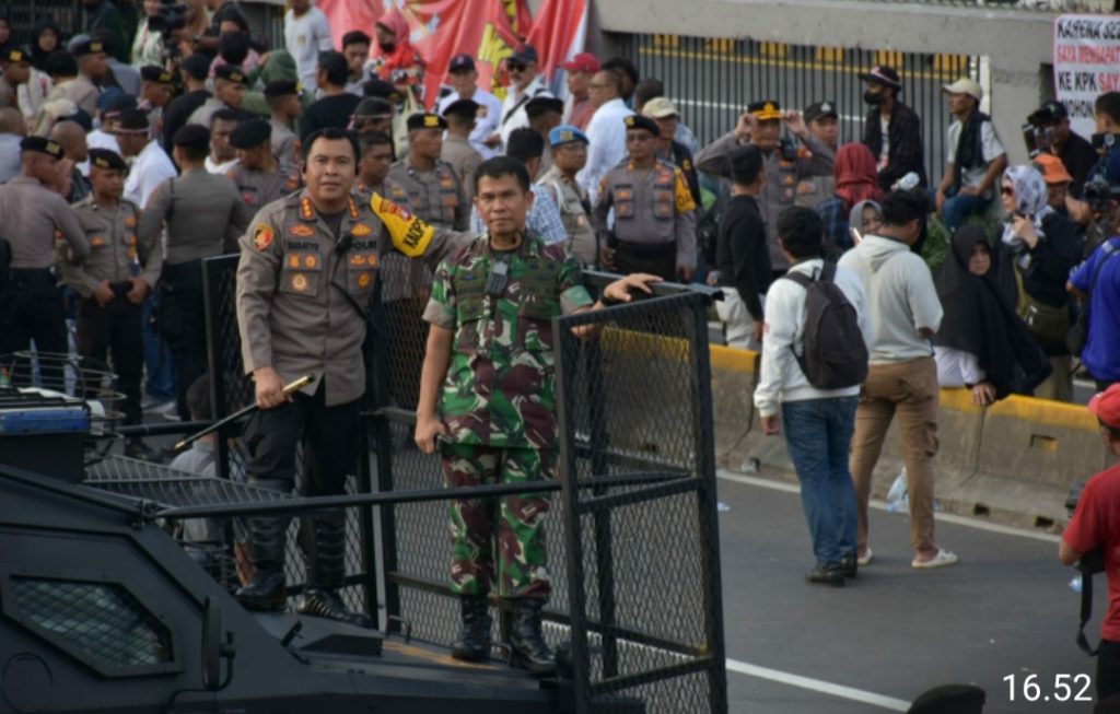 Jakarta Pusat- Komandan Kodim 0501/JP Letkol Inf I.E. Bangun Siregar, S.H. MIPOL bersama Kapolres Metro Jakarta Pusat Kombes Pol Susatyo Purnomo Condro, S.H., SIK, M.Si, mengecek langsung kesiapan personel yang melaksanakan pengamanan massa yang melaksanakan unjuk rasa (Unras) bertempat di depan pintu gerbang Gedung DPR/ MPR RI Senayan Jl. Jend. Gatot Soebroto, Tanah Abang, Jakarta Pusat, Jumat, (1/3/2024)
