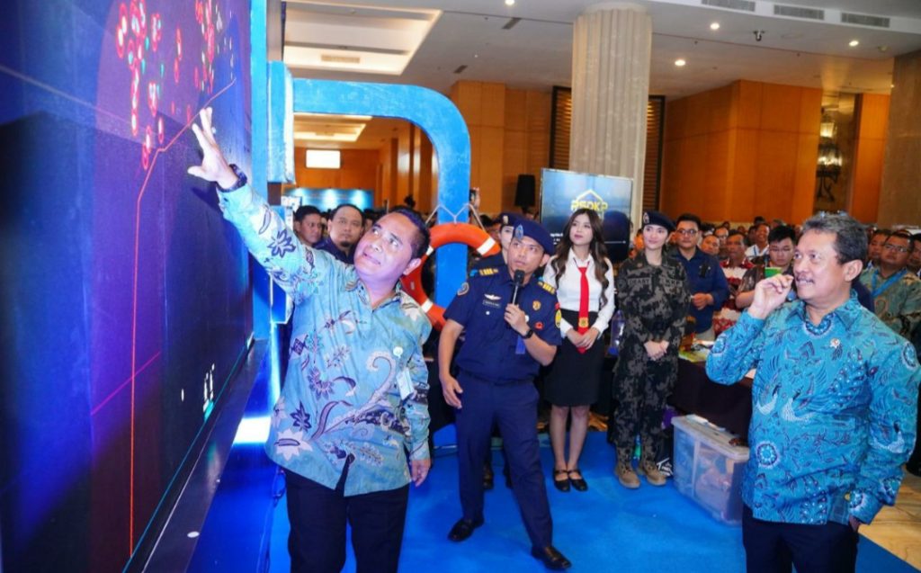 Caption: Plt. Direktur Jenderal Pengawasan Sumber Daya Kelautan dan Perikanan (PSDKP), Dr. Pung Nugroho Saksono, A.Pi., M.M. (Ipunk) menunjukkan cara kerja Sistem Pemantauan Kapal Perikanan (SPKP) kepada Menteri Kelautan dan Perikanan, Sakti Wahyu Trenggono dalam mendeteksi pelanggaran yang dilakukan oleh kapal perikanan, salah satunya pelanggaran berupa penangkapan ikan yang dilakukan tidak sesuai Daerah Penangkapan Ikan (DPI).