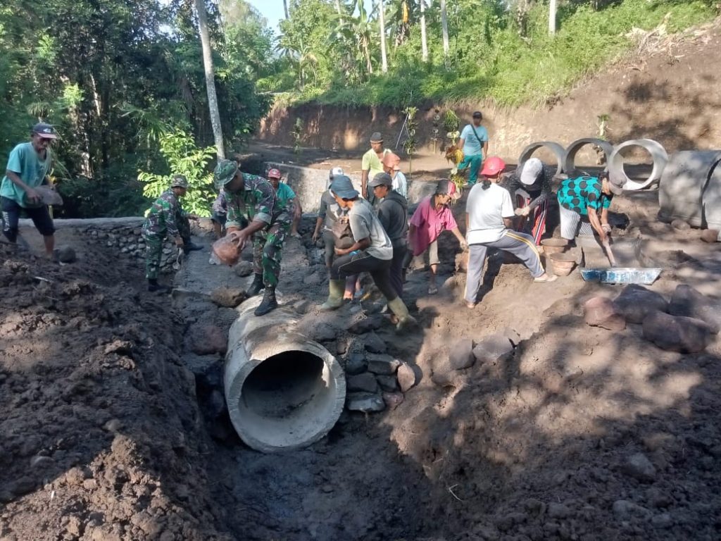 Di setiap harinya, anggota Satgas TMMD dengan dibantu warga setempat terus bergelut dengan material dan suara mesin molen serta berpacu dengan waktu. Satu di antara target mereka adalah pengerasan jalan dan pemasangan gorong-gorong.