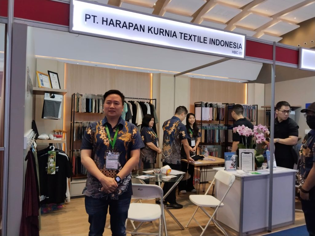 Kevin Hansen Kurnia Director PT. Harapan Kurnia Textile Indonesia menjelaskan untuk pameran tekstil dan garmen 2024 ini kita mempunyai koleksi-koleksi terbaru dari PT. Harapan Kurnia Textile Indonesia. Kain-kain kami buat meeting seperti kaos terbuat dari bahan katun, Polyester, dan banyak jenis lainnya.