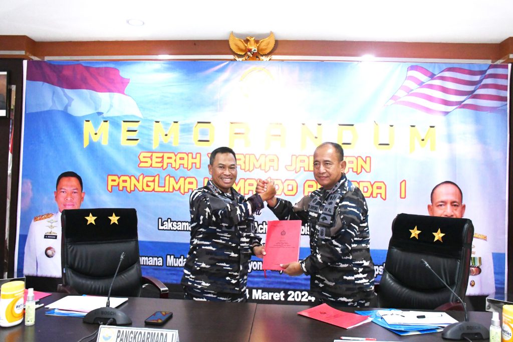 TNI AL-Dispenlantamal3. Komandan Pangkalan Utama TNI Angkatan Laut (Danlantamal) III Jakarta Brigjen TNI (Mar) Harry Indarto, S.E., M.M. menghadiri acara admiral inspection dan pembacaan memorandum serah terima jabatan (Sertijab) Panglima Komando Armada (Pangkoarmada) I dari Laksda TNI Achmad Wibisono, S.E., CHMRP. kepada Laksda TNI Yoos Suryono Hadi, M.Tr.(Han)., M.Tr.Opsla., CHRMP. bertempat di ruang TFG Satkor Koarmada I kesatrian Pondok Dayung, Jakarta Utara, Minggu (25/03/2024).