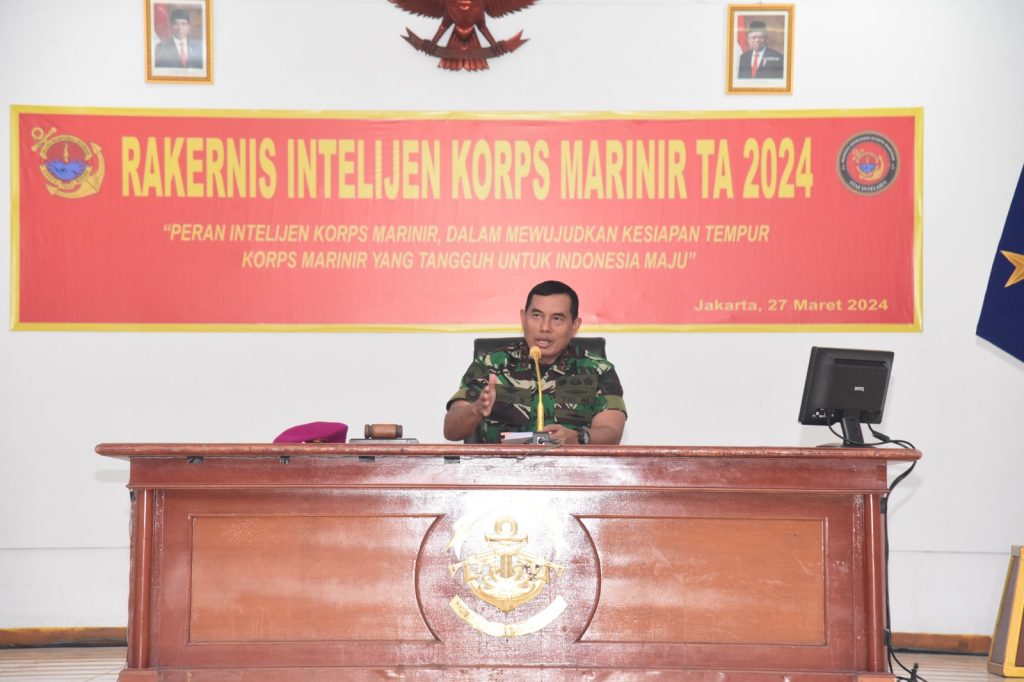 Sambutan Dankormar pada acara rakernis intelijen tahun 2024 “Pentingnya peran intelijen dalam mendukung operasional Korps Marinir, baik dalam misi keamanan nasional maupun operasi kemanusiaan serta perlunya sinergi antara intelijen dengan instansi terkait serta pembaruan terus-menerus dalam teknologi dan metode kerja intelijen”.