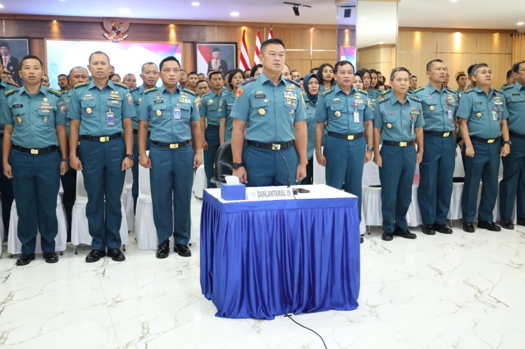 TNI AL–Dispenlantamal3. Komandan Pangkalan Utama TNI Angkatan Laut (Danlantamal) III Jakarta Brigjen TNI (Mar) Harry Indarto, S.E., M.M. mengikuti entry briefing Panglima Komando Armada (Pangkoarmada) I Laksda TNI Yoos Suryono Hadi, M.Tr.(Han)., M.Tr.Opsla., CHRMP. diikuti Wadan Lantamal III Jakarta Kolonel Laut (P) Whisnu Kusardianto, S.E., M.H., dan seluruh Perwira, Bintara, Tamtama serta Pegawai Negeri Sipil (PNS) di lingkungan Lantamal III Jakarta melalui video conference (Vicon) bertempat di Gedung Serbaguna (GSG) Mako Lantamal III Jakarta Jl. Gunung Sahari No. 2 Ancol, Jakarta Utara, Kamis (28/03/2024).
