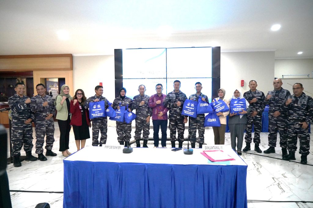 TNI AL-Dispenlantamal3. Komandan Pangkalan Utama TNI Angkatan Laut (Danlantamal) III Jakarta Brigjen TNI (Mar) Harry Indarto, S.E., M.M. menyerahkan paket lebaran kerja sama dengan Bank BRI dan Primer Koperasi Angkatan Laut (Primkopal) Lantamal III Jakarta dihadiri Pimpinan Bank BRI Cabang Kemayoran Yogie Wirawan Murtiono bertempat di Gedung Serbaguna (GSG) Mako Lantamal III Jakarta Jl. Gunung Sahari Ancol, Jakarta Utara, Rabu (03/04/2024).