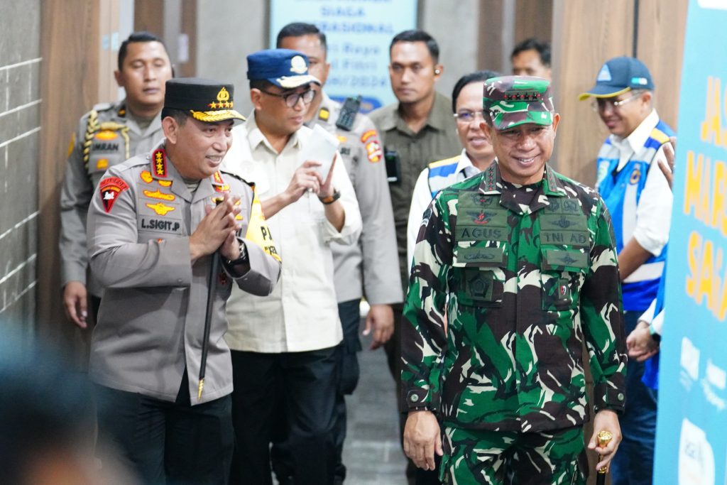 Puspen TNI- Panglima TNI Jenderal TNI Agus Subiyanto, S.E., M.Si, bersama Menteri Perhubungan RI Dr. (H.C.) Ir. Budi Karya Sumadi dan Kapolri Jenderal Pol Drs. Listyo Sigit Prabowo, M.Si, melaksanakan pemantauan arus mudik Idul Fitri 1445 H bertempat di Posko Cikatama, Kantor Jasa Marga KM 70 Gerbang Tol Cikampek Utama, Jawa Barat, Senin (08/04/2024).