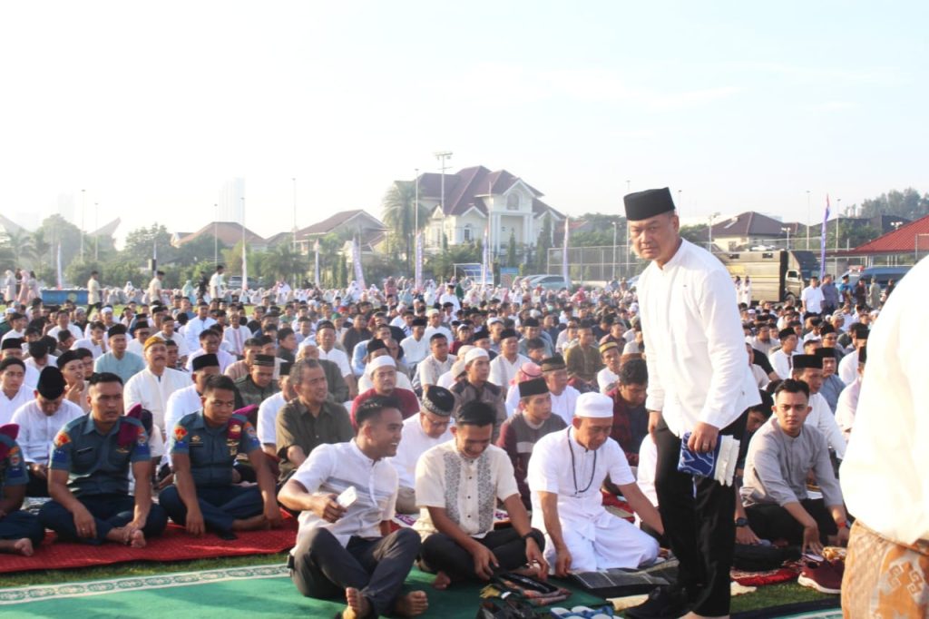 Khotib dalam khotbahnya mengatakan “Sejak tadi malam kita mendengarkan gema takbir, tahlil, dan tahmid saling bersahutan memenuhi ruang angkasa raya dalam menyambut hari raya Idul Fitri 1445 H/2024 M. Hal itu sebagai tanda perpisahan dengan bulan istimewa yaitu bulan suci Ramadhan yang penuh kasih sayang (rahmah) dan ampunan (magfirah) dari Allah Subhanahu wa Ta’ala serta penebus api neraka (itqun minan-nar). Kita semua mengucapkan syukur Alhamdulillah karena tahun ini masih diberi kesempatan bertemu dengan bulan suci Ramadhan dan hari raya Idul Fitri yang penuh berkah ini. Semoga amal ibadah yang kita jalankan selama bulan suci Ramadhan diterima Allah Subhanahu wa Ta’ala, dianugerahi kesehatan dan kekuatan serta keistiqamahan untuk menjalankan semua perintahNya dan meninggalkan segala laranganNya”.