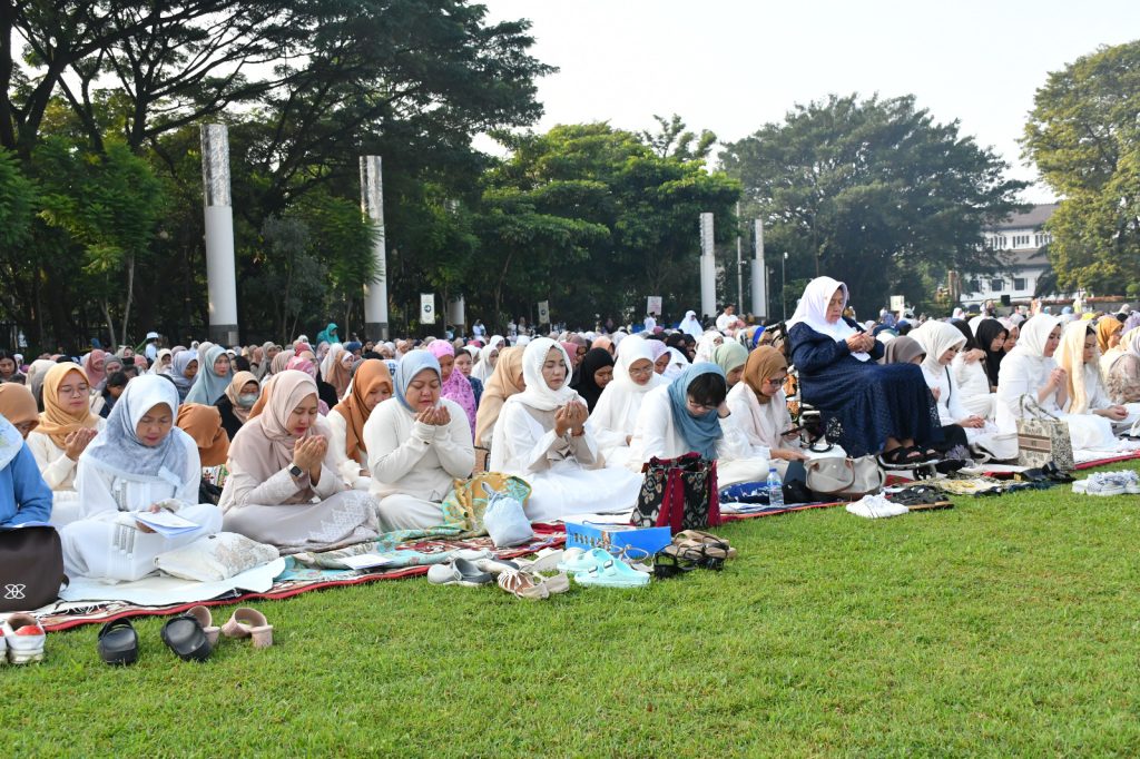 Sebelum pelaksanaan Sholat Idhul Fitri disampaikan sambutan Pj. Gubernur Jawa Barat Bey Machmudin menyampaikan ucapan selamat Hari Raya Idul Fitri 1 Syawal 1445 Hijriah mohon maaf lahir dan batin, marilah kita bersyukur atas limpahan rahmat dan karunia Allah Subhanahu Wa ta’ala yang telah memungkinkan kita untuk mencapai momen penuh berkah ini. Idul Fitri bukan sekedar perayaan kemenangan setelah kita menjalani ibadah puasa selama satu bulan tetapi juga merupakan momentum penting untuk merenungkan makna dan nilai-nilai ritual yang terkandung didalamnya.