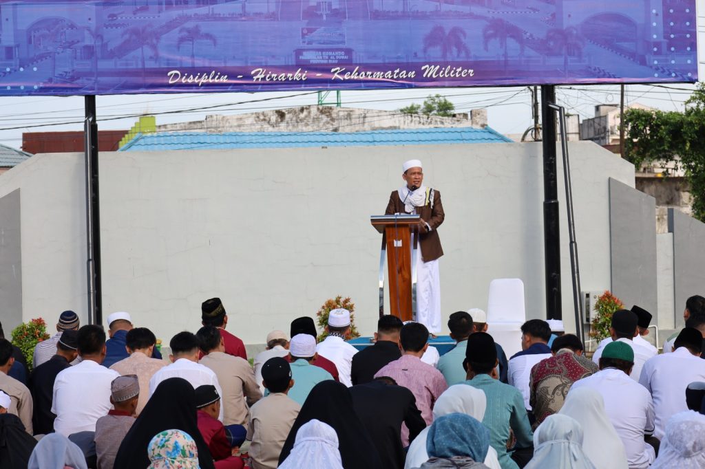 TNI AL, Dumai,- Komandan Pangkalan TNI Angkatan Laut Dumai Kolonel Laut (P) Boy Yopi Hamel dan Ketua Cabang 4 Korcab I DJAI Ny. Gressy Hamel bersama Keluarga Besar Prajurit Lanal Dumai, serta masyarakat sekitar Mako Lanal Dumai melaksanakan Sholat Idul Fitri 1445 H/2024 M di Lapangan Apel Markas Komando Lanal Dumai, Jalan Yos Soedarso No. 1, Kelurahan Buluh Kasap, Kecamatan Dumai Timur, Kota Dumai, Rabu (10/04/2024).