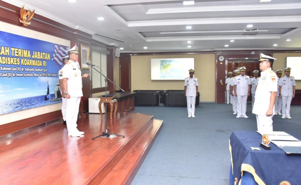 TNI Angkatan Laut, Koarmada RI, Jakarta 18 April 2024-Jabatan Kepala Dinas Kesehatan (Kadiskes) Komando Armada Republik Indonesia (Koarmada RI) diserahterimakan dari Kolonel Laut (K) dr. Isdiyanto Septiadi, Sp.U. kepada Kolonel Laut (K) dr. Imam Syuhada, M.Kes., Sp. THT.KL., M.Tr.Hanla., yang dipimpin langsung oleh Panglima Komando Armada Republik Indonesia (Pangkoarmada RI) Laksamana Madya TNI Dr. Denih Hendrata, S.E., M.M., CHRMP., bertempat di Lounge Matjan Kumbang, Mako Koarmada RI, Jakarta Pusat, Kamis 18 Maret 2024. Acara serah terima jabatan ditandai dengan pengambilan sumpah dan penandatanganan fakta Integritas.