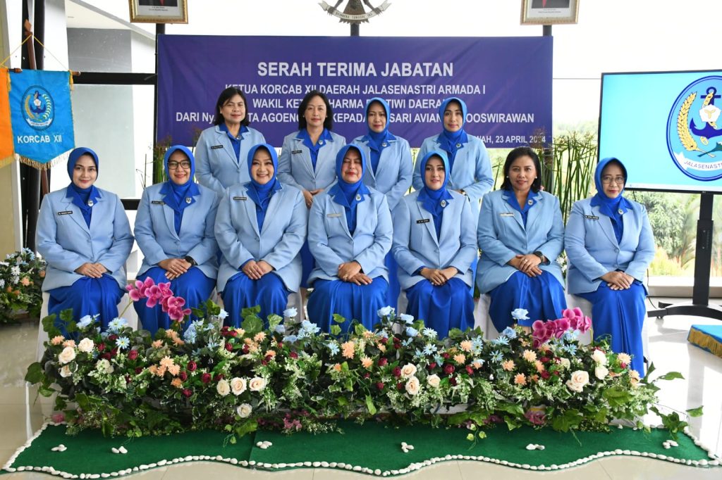 TNI AL – Dispenlantamal3. Ketua Koordinator Cabang (Korcab) III Daerah Jalasenastri Armada (DJA) I Ny. Neneng Harry Indarto menghadiri serah terima jabatan (Sertijab) Ketua Korcab XII DJA I dan Pengawas Cabang Pontianak Yayasan Hang Tuah (YHT) dari Ny. Arietta Agoeng MKS kepada Ny. Sari Avianto Rooswirawan yang dipimpin langsung oleh Ketua Daerah Jalasenastri Armada I Ny. Yanti Yoos Suryono bertempat di ruang rapat 2 Mako Lantamal XII Pontianak, Kalimantan Barat, Selasa (23/04/2024).