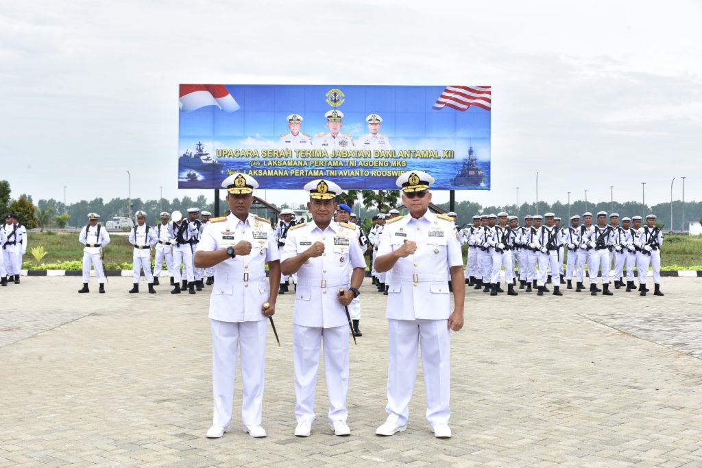 TNI AL, Belawan,- Komandan Pangkalan Utama TNI Angkatan Laut I (Danlantamal I) Brigjen TNI (Mar) Jasiman Purba, S.E., CHRMP., didampingi Ketua Korcab I DJA I Ny. Othy Jasiman Purba, menghadiri Upacara Serah Terima Jabatan (Sertijab) Danlantamal XII dari Laksamana Pertama TNI Agoeng MKS, kepada Laksamana Pertama TNI Avianto Rooswirawan, S.E., M.Si., M.Tr.Opsla., berdasarkan Keputusan Panglima TNI Nomor Kep/382/IV/2024, Tentang Pemberhentian dari dan Pengangkatan Dalam Masa Jabatan di Lingkungan Tentara Nasional Indonesia, dipimpin oleh Panglima Koarmada I Laksamana Muda TNI Dr. Yoos Suryono H, M.Tr.(Han)., M.Tr.Opsla., bertempat di Lapangan Upacara Mako Lantamal XII, Jalan Wajok Hilir KM 17 Kabupaten Mempawah, Kalimantan Barat, Selasa (23/4/2024).