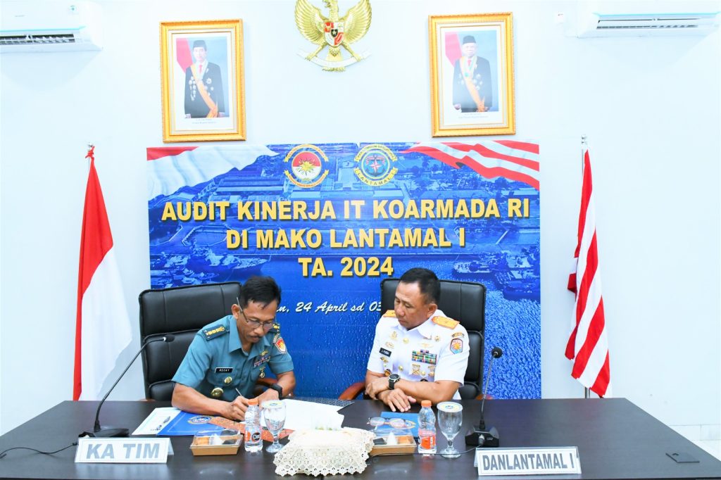 TNI AL, Belawan,- Komandan Pangkalan Utama TNI Angkatan Laut I (Danlantamal I ) Brigjen TNI (Mar) Jasiman Purba, S. E., CHRMP., menghadiri Taklimat Akhir Audit Kinerja IT Koarmada RI Tahun 2024, bertempat di Ruang Rapat Mako Lantamal I, Jalan Serma Hanafiah No. 01 Belawan, Sumatera Utara, Jumat (03/5/2024).