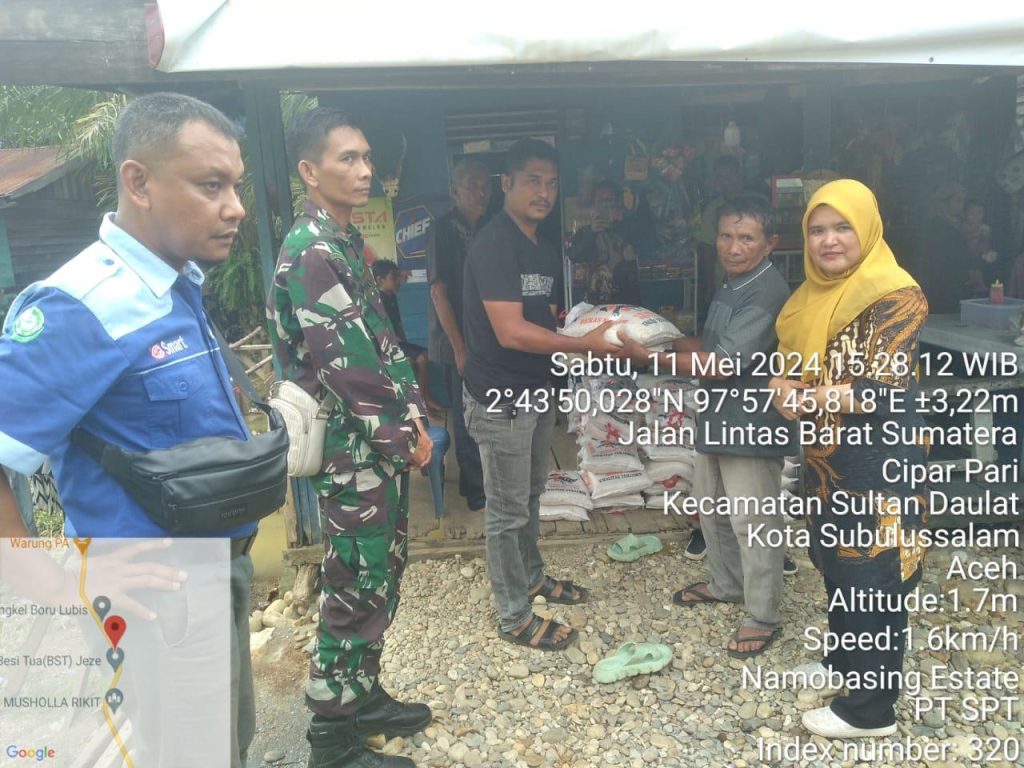 bantuan beras kepada warga terdampak banjir yang diserahkan langsung secara simbolis oleh Manajer PT SPT didampingi Babinsa
