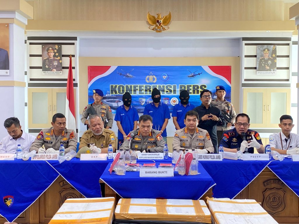 Caption : Direktur Pengawasan Sumber Daya Perikanan, Drama Panca Putra bersama Ditpolairud Polda Jambi dan Dinas Kelautan dan Perikanan Jambi menggelar Konferensi Pers Penggagalan Penyelundupan Benih Bening Lobster (BBL) di Kota Jambi, Provinsi Jambi, pada Senin (13/05/2024). Dalam konferensi pers tersebut, disampaikan bahwa Ditjen PSDKP bersama Polri berhasil menggagalkan 125 ribu BBL di Jambi.