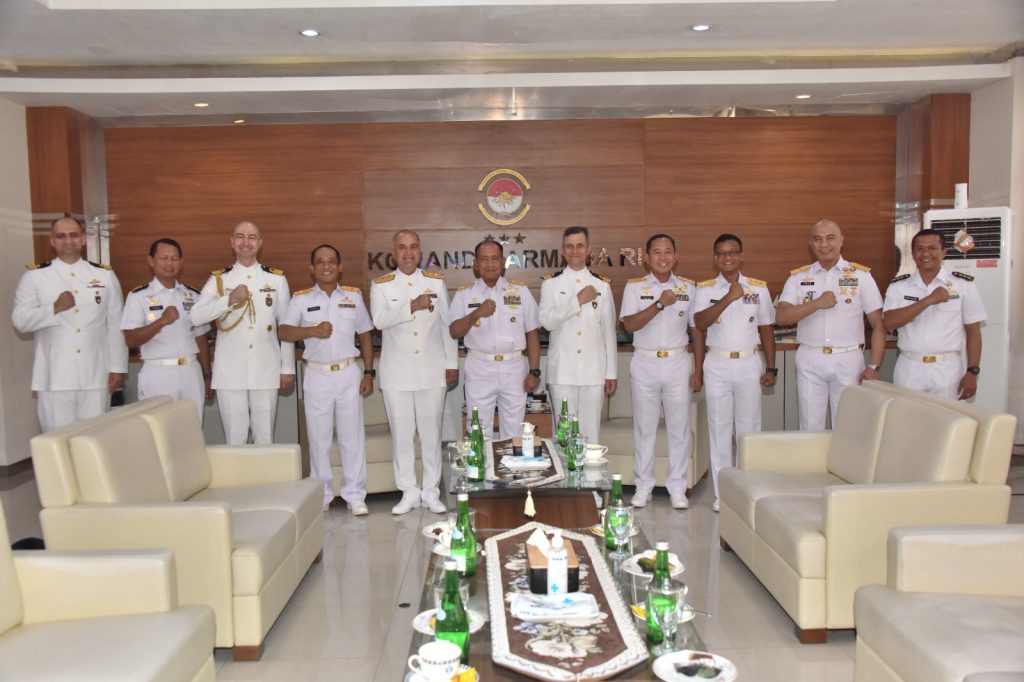 Jakarta, TNI Angkatan Laut, Koarmada RI-Panglima Komando Armada I Laksamana Muda TNI Yoos Suryono Hadi, M.Tr.(Han)., M.Tr.Opsla, mewakili Pangkoarmada RI Laksamana Madya TNI Dr. Denih Hendrata, S.E., M.M., CHRMP., didampingi Kaskoarmada RI Laksamana Muda TNI Didong Rio Duto Purwo Kuntjoro, S.T., M.A.P., M.Tr.(Han) dan Pangkolinlamil Laksamana Muda TNI Hudiarto Krisno Utomo, M.A., M.M.S., CHRMP., menerima Courtesy Call Commander of Turkish The Northern Sea Area Command, Rear Admiral Rafel Oktar bertempat di ruang VIP room Markas Komando Koarmada RI, Jumat, (17/5).