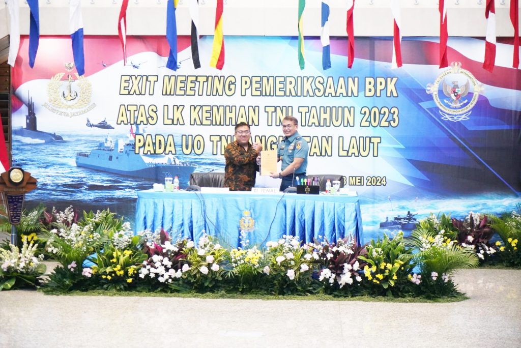 TNI AL–Dispenlantamal3. Komandan Pangkalan Utama TNI Angkatan Laut (Danlantamal) III Jakarta Brigjen TNI (Mar) Harry Indarto, S.E., M.M. menghadiri Exit Meeting Pemeriksaan Badan Pemeriksa Keuangan (BPK) RI atas Laporan Keuangan (LK) Kementerian Pertahanan (Kemhan) RI dan TNI pada Unit Organisasi (UO) TNI Angkatan Laut yang ditutup oleh Inspektur Jenderal Angkata Laut (Irjenal) Laksda TNI Rubiyanto, S.E., M.M., CHRMP, C.Fr.A. selaku Penanggung Jawab, dihadiri Wakil Penanggung Jawab I Tim Pemeriksa BPK RI Dr. Edy Witono, S.E., M.M., CSFA, CertDA, CIISA bertempat di Auditorium Denma Mabesal Cilangkap, Jakarta Timur, Selasa (28/05/2024).