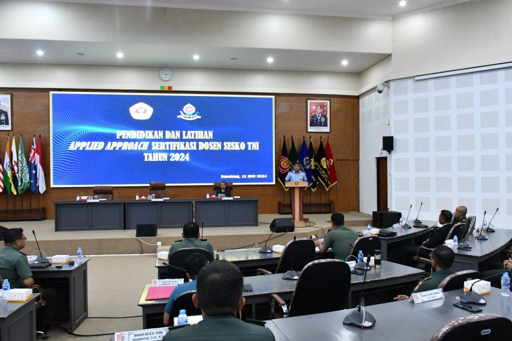 Bandung,- Komandan Sesko TNI Marsdya TNI Arif Widianto, S.A.B., M.Tr.(Han)., CHRMP., membuka acara Pendidikan dan Latihan Applied Approach (AA) Sertifikasi Dosen Sesko TNI TA. 2024 yang bekerjasama dengan Universitas Pasundan Bandung, bertempat di Kelas Besar Adibrata, Sesko TNI, Bandung, Rabu (12/6/2024).