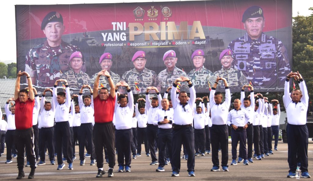 Dispen Kormar TNI Angkatan Laut (Jakarta). Prajurit Petarung Korps Marinir Wilayah Barat melaksanakan olahraga bersama Kepala Staf Angkatan Laut (Kasal) Laksamana TNI Dr. Muhammad Ali, S.E., M.M., M.Tr.Opsla. dan Komisaris Utama PT Pertamina Bapak Ir.Simon Aloysius Mantiri, S.T., M.B.A. beserta Staf yang dilaksanakan di Kesatrian Marinir Hartono Cilandak Jakarta Selatan. Kamis (18/07/2024).