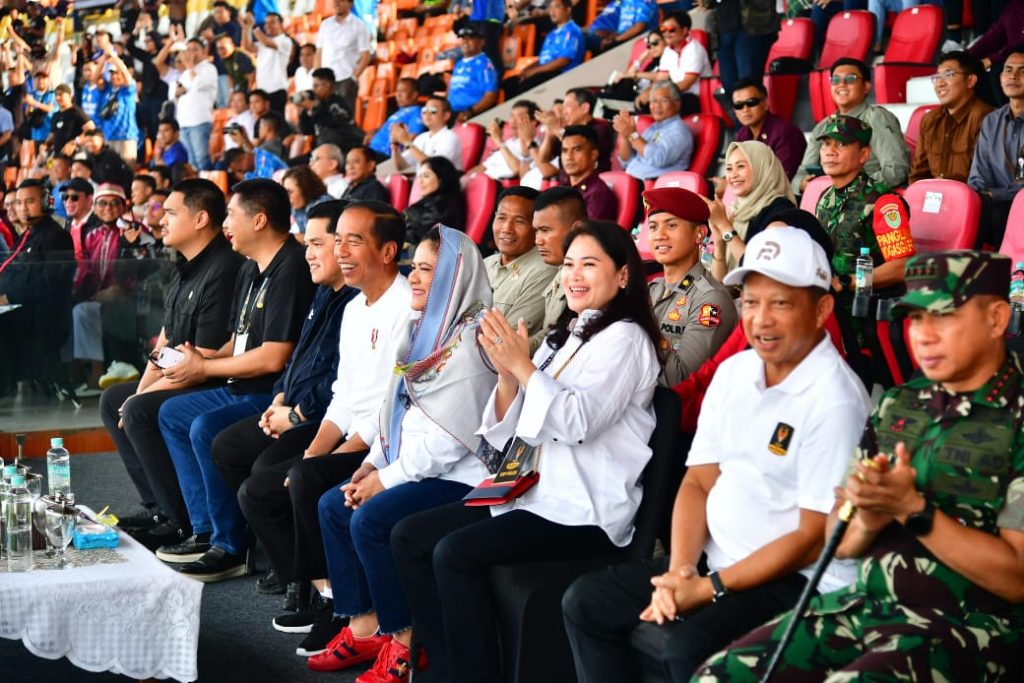 Puspen TNI- Panglima TNI Jenderal TNI Agus Subiyanto mendampingi Presiden RI Joko Widodo menyaksikan laga perdana pembukaan turnamen sepak bola Piala Presiden Tahun 2024, bertempat di Stadion Si Jalak Harupat, Kabupaten Bandung, Jawa Barat, Jumat (19/7/2024).