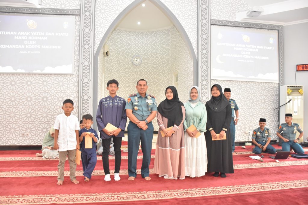 Dispen Kormar TNI Angkatan Laut (Jakarta). Komandan Korps Marinir (Dankormar) Mayor Jenderal TNI (Mar) Endi Supardi, S.E., M.M., M.Tr.Opsla., CHRMP., CRMP. menggelar kegiatan keagamaan kajian Tematik Al-Quran dan pemberian santun kepada anak Yatim dan Piatu di Masjid At-Taqwa Mako Kormar, Jalan Prajurit KKO Usman dan Harun No. 40 Kwitang, Jakarta Pusat, Senin (22/07/2024).