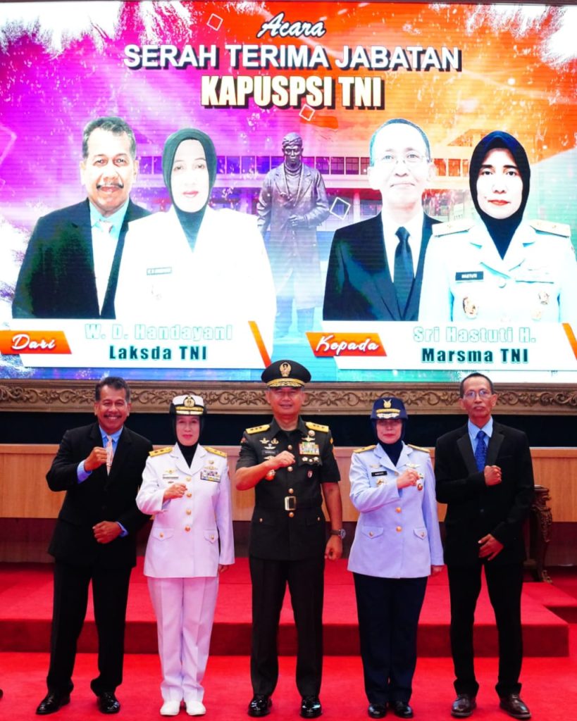 Puspen TNI-Kasum TNI Letjen TNI Bambang Ismawan, S.E., M.M. mewakili Panglima TNI Jenderal TNI Agus Subiyanto memimpin upacara Serah Terima Jabatan (Sertijab) Kapuspsi TNI dari Laksda TNI Dr. Wiwin Dwi Handayani, S.Psi., M.Si., CHRMP. kepada Marsma TNI Dra. Sri Hastuti Handayani, M.Si., M.Han., Psikolog., bertempat di Aula Gatot Soebroto Mabes TNI, Cilangkap, Jakarta Timur. Rabu (31/07/2024).
