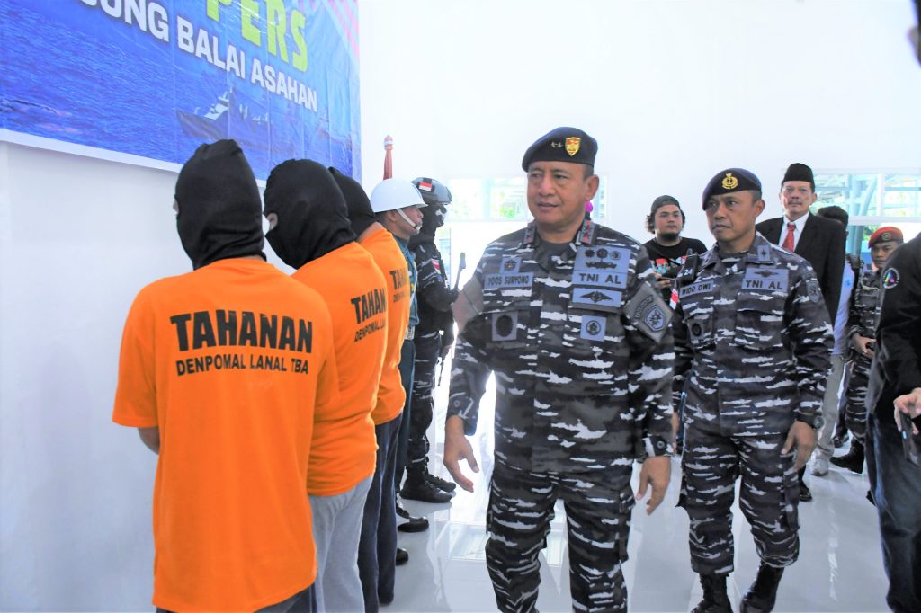 TNI AL, Belawan,- Komandan Pangkalan Utama TNI Angkatan Laut I (Danlantamal I) Brigjen TNI (Mar) Jasiman Purba, S.E., CHRMP., beserta Danlanal TBA Letkol Laut (P) Wido Dwi Nugraha, S.E., M.Tr. Opsla., mendampingi Pangkoarmada I Laksda TNI Dr. Yoos Suryono Hadi, M.Tr.(Han)., M.Tr.Opsla., dalam Press Conference terkait penangkapan tiga orang dan 20 bungkus Teh Cina Hijau yang diduga Narkotika jenis sabu-sabu, dengan berat total 21.244 gram atau sekitar 21 kg senilai 25 Milyar Rupiah, oleh Tim Fleet One Quick Response (F1QR) Pangkalan TNI AL Tanjung Balai Asahan (Lanal TBA), bertempat di Gedung Owa Mako Lanal Tanjung Balai Asahan, Jumat (16/8/2024).
