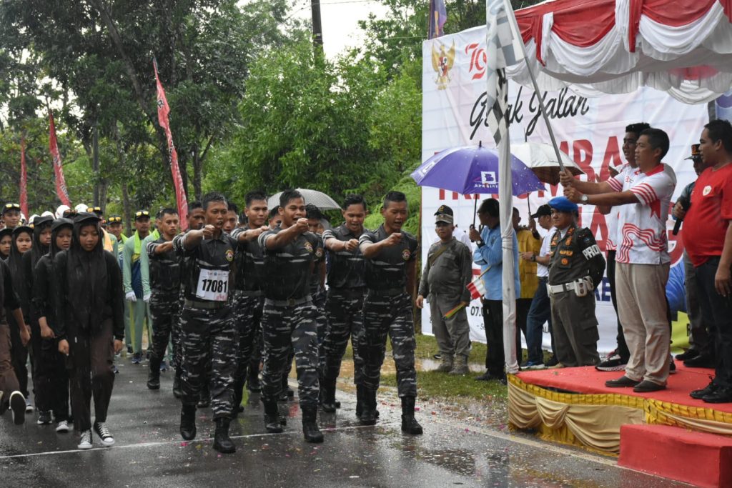Komandan Lanal Bintan Letkol Laut (P) Eko Agus Susanto, S.E., M.M., mendampingi Bupati Bintan beserta jajaran Forkopimda Bintan memberangkatkan para Peserta Gerak Jalan Tri Lomba Juang tersebut yang diikuti 300 tim peserta, terdiri dari tiga kategori yakni 5 Km, 8 Km, dan 17 Km.