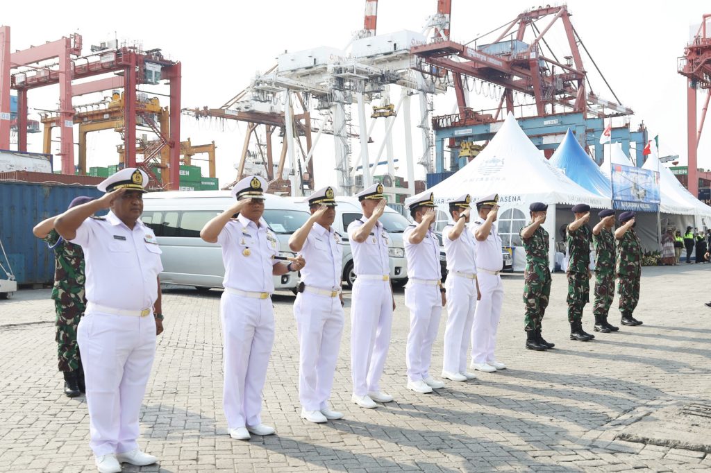 TNI AL-Dispenlantamal3. Komandan Pangkalan Utama TNI Angkatan Laut (Danlantamal) III Jakarta Brigjen TNI (Mar) Harry Indarto, S.E., M.M. diwakili oleh Komandan Satuan Kapal Patroli (Dansatrol) Lantamal III Jakarta Letkol Laut (P) Yovan Ardhianto Yusuf, S.E., M.Tr.Opsla., CHRMP. melepas keberangkatan kapal perang Angkatan Laut Italia ITS Cavour (C-550) dengan Komandan Captain (N) Francesco Fagnani bertempat di dermaga 300-301 pelabuhan Tanjung Priok, Jakarta Utara, Selasa (17/09/2024).