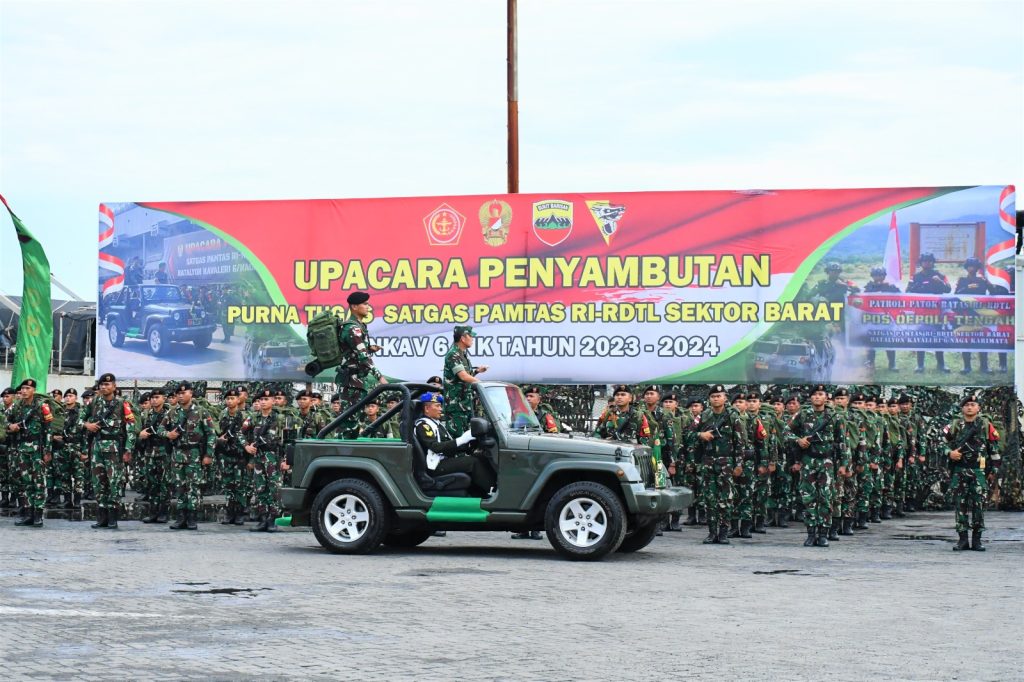 Bertindak selaku Inspektur Upacara Pangdam I/BB Mayjen TNI Mochammad Hasan. Dalam amanatnya, Pangdam I/BB menyampaikan upacara penyambutan ini merupakan wujud rasa hormat dan bangga sekaligus rasa syukur serta penghargaan komando kepada prajurit yang tergabung dalam Satgas pengamanan perbatasan darat RI-RDTL TA. 2023-2024, yang telah menunjukkan dedikasi tinggi dalam melaksanakan tugas secara profesional, melalui pengabdian yang ikhlas dan kesadaran untuk berbuat yang terbaik demi menjaga kedaulatan Negara Kesatuan Republik Indonesia, khususnya di Wilayah Perbatasan Darat RI-RDTL dalam kurun waktu kurang lebih 12 bulan. Selesai upacara dilanjutkan acara tambahan yaitu acara tradisi penyambutan serta ucapan selamat datang dari para undangan.