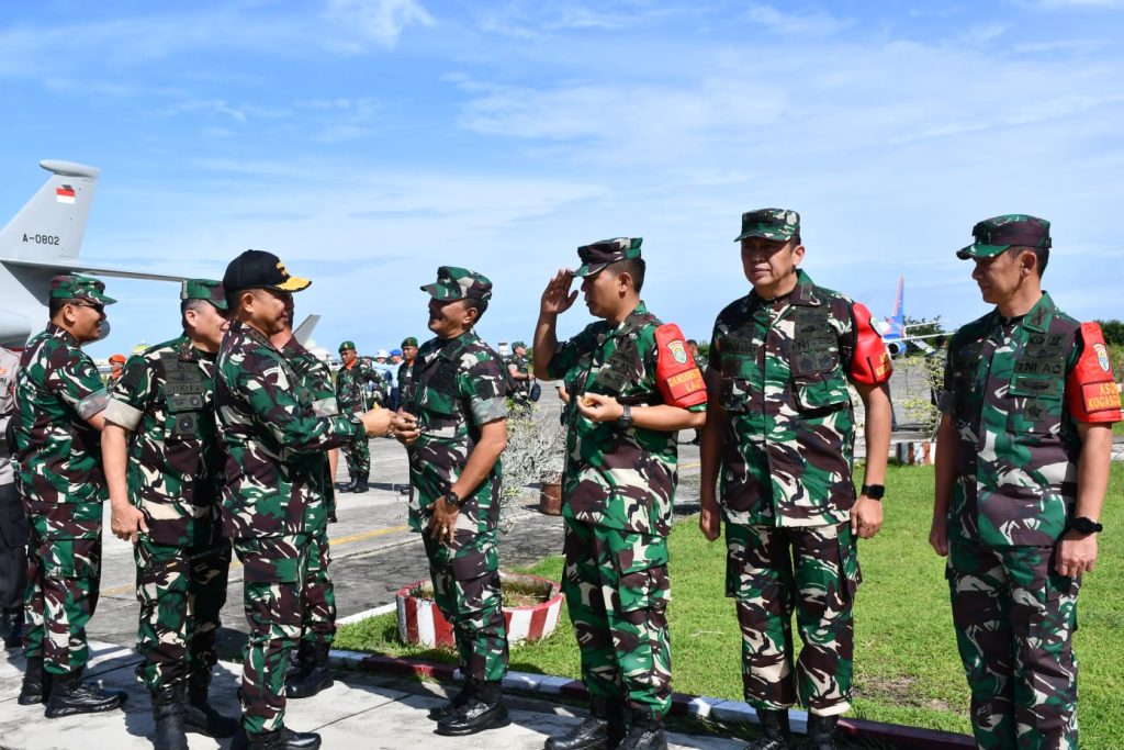 TNI AL, Sabang,- Komandan Lanal Sabang (Danlanal Sabang) Kolonel Laut (P) Gita Muharam, M.Sc., beserta Unsur Forkopimda Provinsi Aceh sambut kedatangan Panglima TNI Jenderal TNI Agus Subiyanto dalam rangka mendampingi Kunker Presiden RI Ir. H. Joko Widodo beserta rombongan di Provinsi Aceh untuk meresmikan IJD (Inpres Jalan Daerah) dan Peresmian Gedung Pusat Aneuk Muda Aceh Unggul Hebat Kabupaten Aceh Besar, dengan menggunakan pesawat BBJ2/A-001, bertempat di Bandar Udara Internasional Sultan Iskandar Muda, Kecamatan Blang Bintang, Kabupaten Aceh Besar, Selasa (15/10/2024).