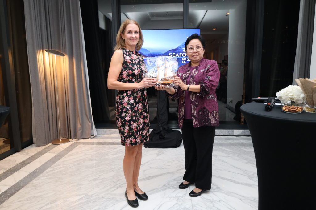 Caption Foto: Kepala BPPMHKP Ishartini dan Duta Besar Norwegia untuk Indonesia Rut Krüger Giverin pada acara light dinner di Jakarta, 14 November 2024. Pertemuan membahas penguatan kerjasama dan kolaborasi bidang quality assurance produk perikanan.