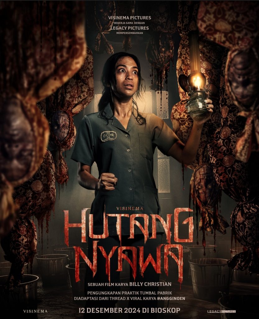 Poster film Hutang Nyawa didominasi suasana gelap dan intens yang memunculkan rasa takut serta misteri. Di tengah-tengahnya, sosok Erwina (diperankan oleh Taskya Namya) yang memakai seragam pabrik, tampak berdiri dengan ekspresi penuh ketakutan. la memegang lampu minyak, satu-satunya sumber cahaya dalam ruangan yang dipenuhi kain batik yang tergantung. Namun, ketegangan semakin meningkat ketika kain-kain tersebut ternyata membungkus sesuatu yang menyerupai tubuh manusia, dengan noda darah yang menetes.