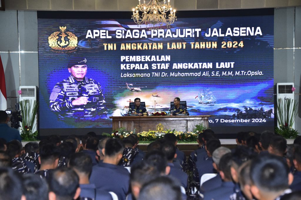 TNI AL-Dispenlantamal3. Komandan Pangkalan Utama TNI Angkatan Laut (Danlantamal) III Jakarta Brigjen TNI (Mar) Harry Indarto, S.E., M.M. mengikuti pembekalan Kepala Staf Angkatan Laut (Kasal) Laksamana TNI Dr. Muhammad Ali, S.E., M.M., M.Tr.Opsla. dalam rangka Apel Siaga Prajurit Jalasena TNI Angkatan Laut tahun 2024, yang dihadiri Wakasal Laksdya TNI Erwin S. Aldedharma, S.E., M.M., M.Sc. bertempat di gedung Maspardi Akademi Angkatan Laut (AAL) Bumimoro, Surabaya, Jawa Timur, Sabtu (07/12/2024).